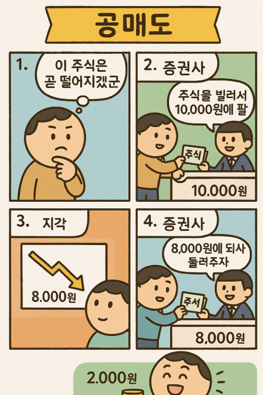 공매도(Short Selling)는 없는 주식을 빌려서 먼저 팔고, 나중에 다시 사서 갚는 투자법이에요.